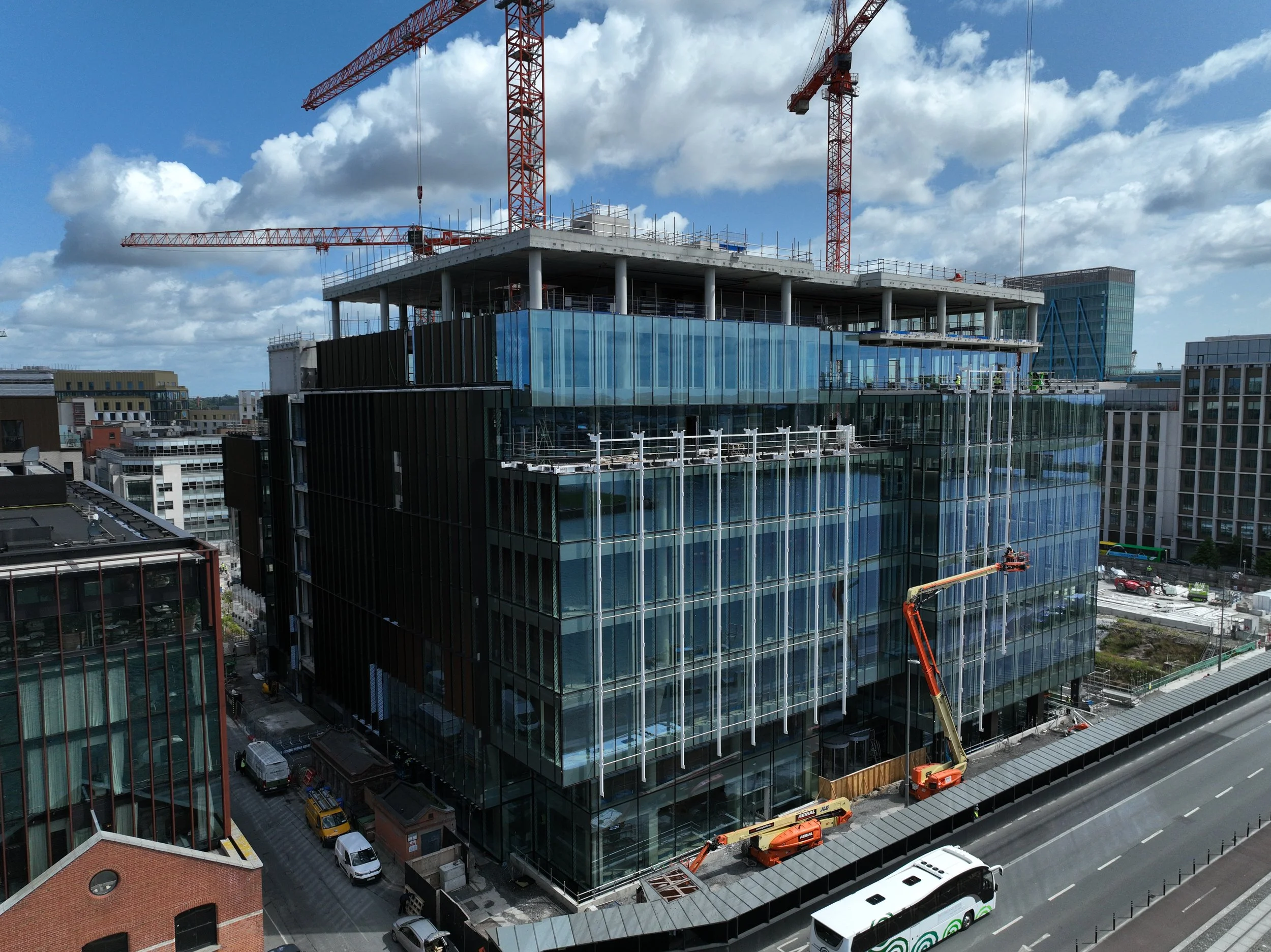 Recent drone footage released by Ronan Group showcases the structural progress on site. The twin veil structural supports along the south elevation are nearing completion, with the upper sections scheduled for installation in the coming weeks. These will support the building’s striking glass veil—a defining architectural feature of the project.